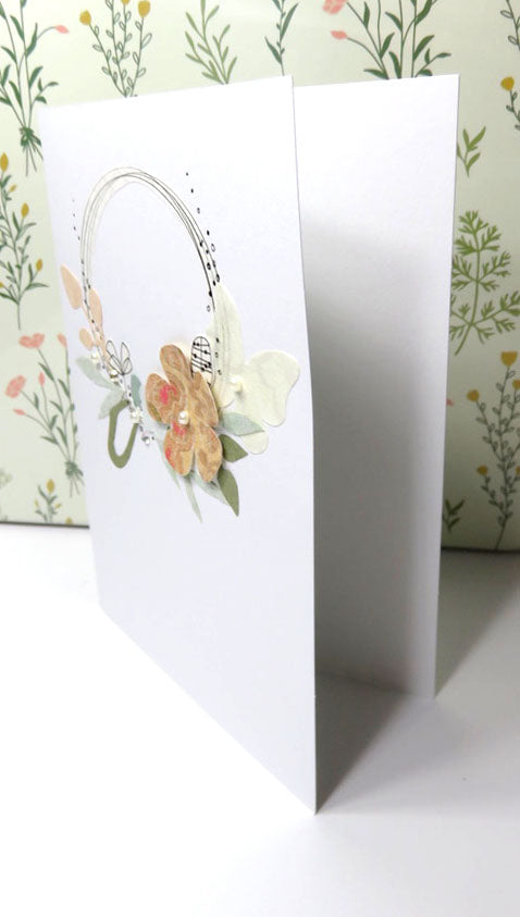 Paper collaged greeting cards. Embellished with artificial gems and pearls with drawn ink elements. Blank inside and comes with an envelope. One card and envelope per purchase.