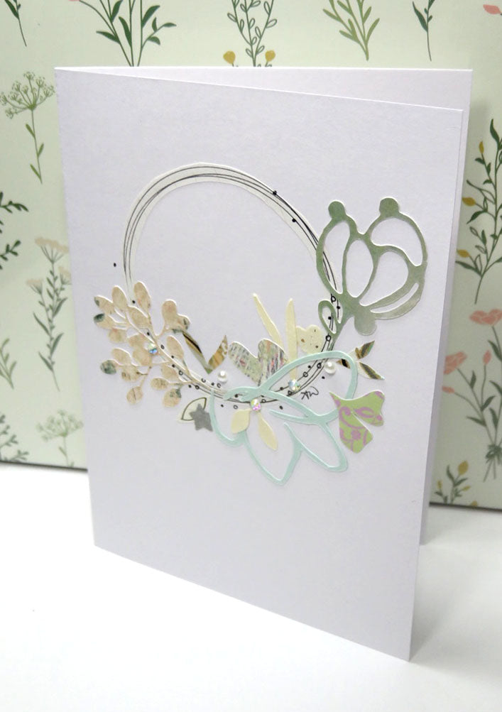 Paper collaged greeting cards. Embellished with artificial gems and pearls with drawn ink elements. Blank inside and comes with an envelope. One card and envelope per purchase.