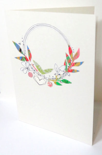 Hand cut paper and drawn collaged greeting cards. Embellished with artificial gems and pearls Blank inside and comes with an envelope. One card and envelope per purchase.