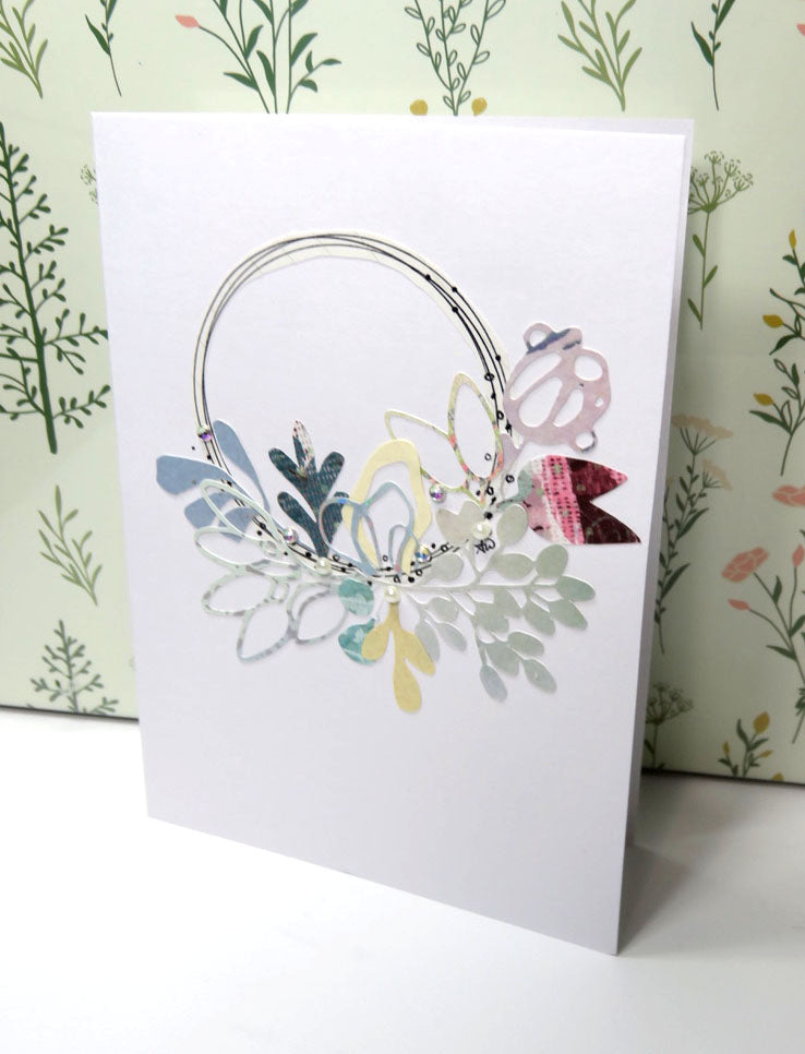 Paper collaged greeting cards. Embellished with artificial gems and pearls with drawn ink elements. Blank inside and comes with an envelope. One card and envelope per purchase.